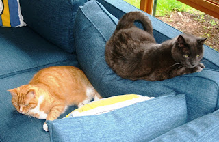 The first visitors to Cape were the cats, fresh from "prison", aka quarantine in Spotswood. They were not happy about going in the travel box again, carried all the way to cape, but soon settled in. They are shown here trying out the nice new upholstery on the big sofas.